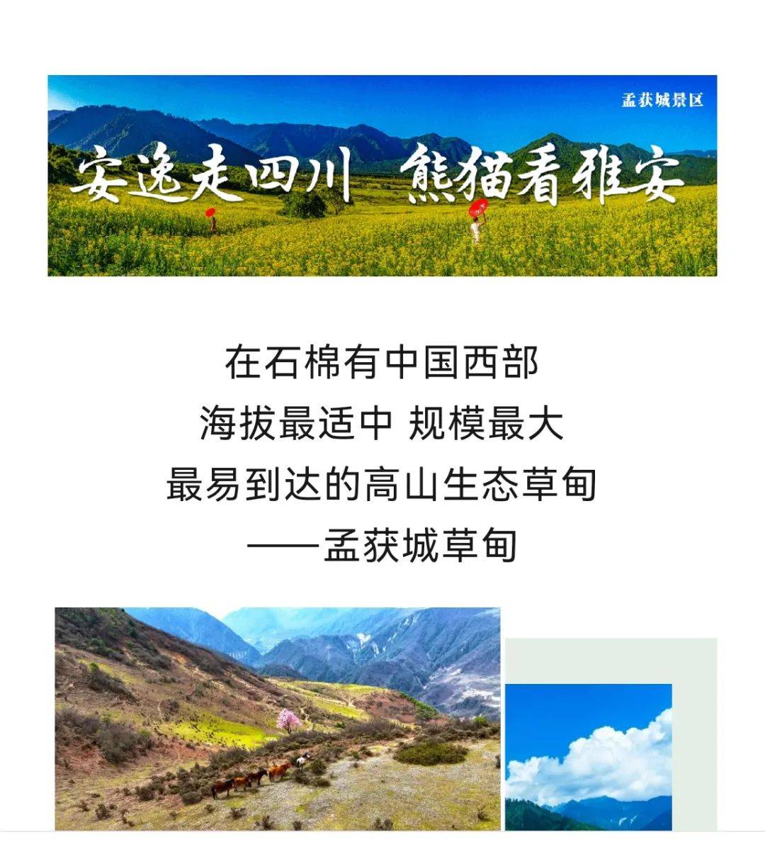 如今,在孟获城,“绿色 生态 开放 共享”的发展理念,已日益深入人心。依托平均海拔2400米的高原森林,“绿色”已成为整个孟获城景区的主色调,也是其旺盛生命力之底色;这里自然生成的草甸、湖泊、雪山、溪流,成百上千种野生动物、植物,一流的生态环境得到了有效的保护;这里,因此形成的人间仙境般的世外桃源,并非闭关锁城,与世隔绝,而是以热情奔放的姿态,对外全方位开放,欢迎各地游客旅游、度假、休闲和沉浸式体验大熊猫乐园、森林探险与水上漂流;不仅让景区内的孟获城彝族新村的全体老百姓分享到了自然之美和人文之美,还给出多个就业岗位,开展多次免费培训,带动彝族乡亲勤劳致富,奏响了民族团结、发展进步和共同致富的友谊之歌;在这里,大森林的一草一木,没有人会去砍伐;在这里,原野、村落不时出没的飞禽走兽,没有人会去捕杀;在这里,人与人和谐相处,人与自然和谐相处。同时,公司还广纳各地各行业英才投资孟获城的文化旅游事业,增加旅游业态,丰富旅游产品,完善服务实施,提升服务质量,吸引更多的游客前来观光旅游、休闲度假,共享盛世天府之“雅西最美驿站”的自然之美和人文之美。
