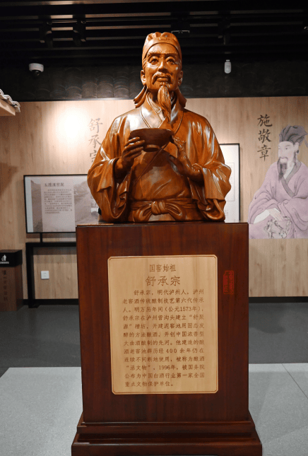 公元1573年(明万历年间),泸州老窖酒传统酿造技艺第六代传承人舒承宗,在泸州营沟头建立“舒聚源”糟坊,开建泥窖池用固态发酵的方法酿酒,开创中国浓香型大曲酒酿制的先河。他所建造的酿酒老窖池群,历经400余年仍在持续不断地使用,被誉为酿酒“活文物”。1996年,被国务院公布为中国白酒行业第一家全国重点文物保护单位。