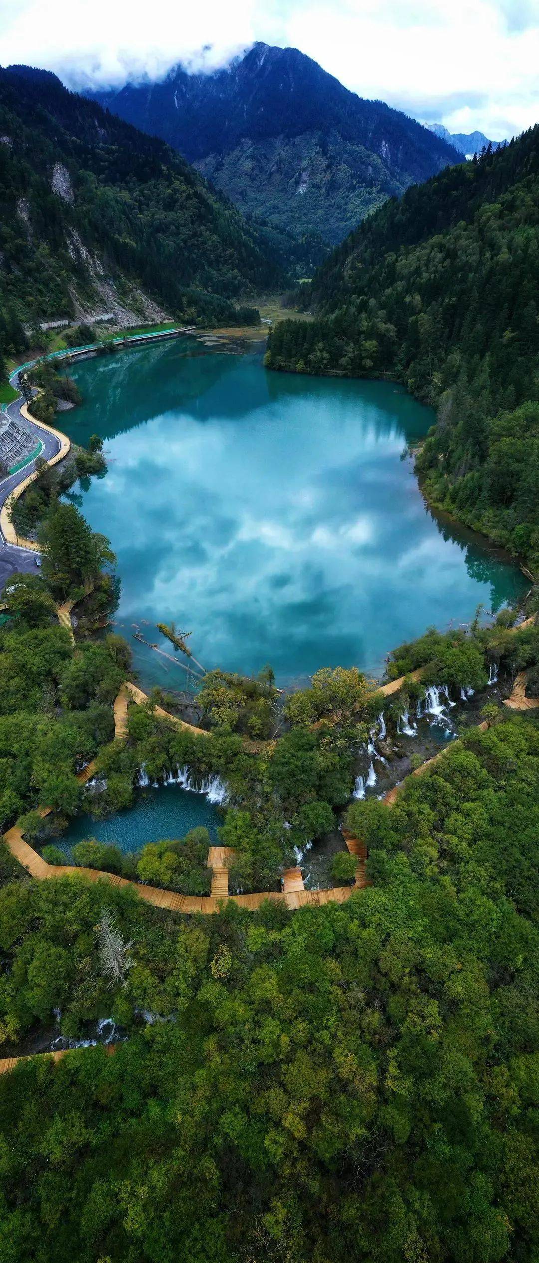 从树正瀑布再向下行走,便是层层错落的大小海子群,上下顺沟叠延五六公里远五彩的水光碧波荡漾,无数美景镶嵌两岸水流在潺潺低吟声中白浪翻卷。