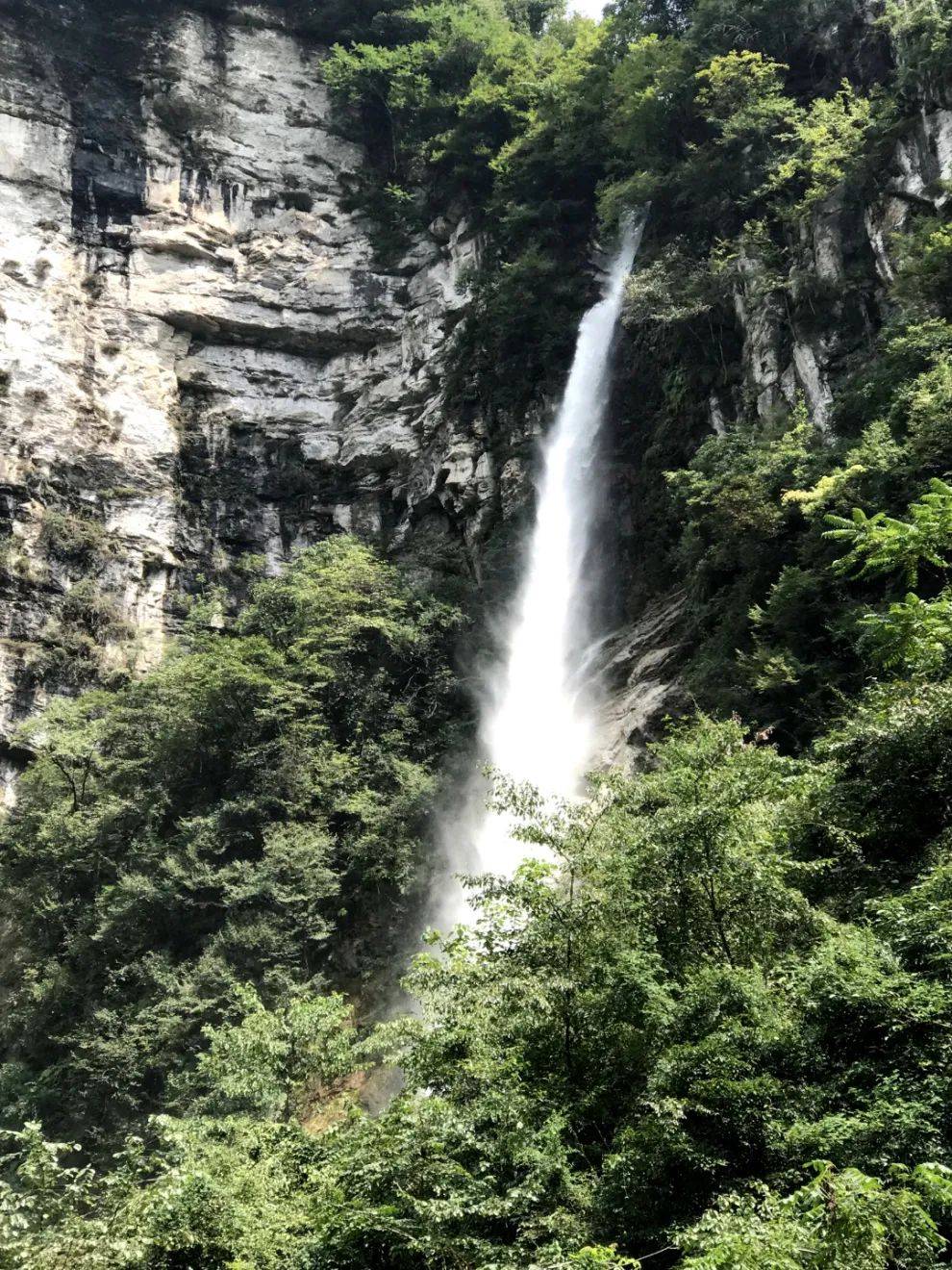 在山路的拐弯处,有一个浅水滩,水流过路面,几位游客在此赤脚戏水,旁边有树木搭成的简易木桥,可沿着这木桥走到对面,一直到山的深处去。但那里又有怎样的风景,却是不得而知的。有风时不时吹过来,瀑布的水雾就飘散过来,带来了些许凉意。我站在山路边上,用手机拍下瀑布的视频。同行的记者对着瀑布长枪短炮式的狂拍,显得有点儿夸张。