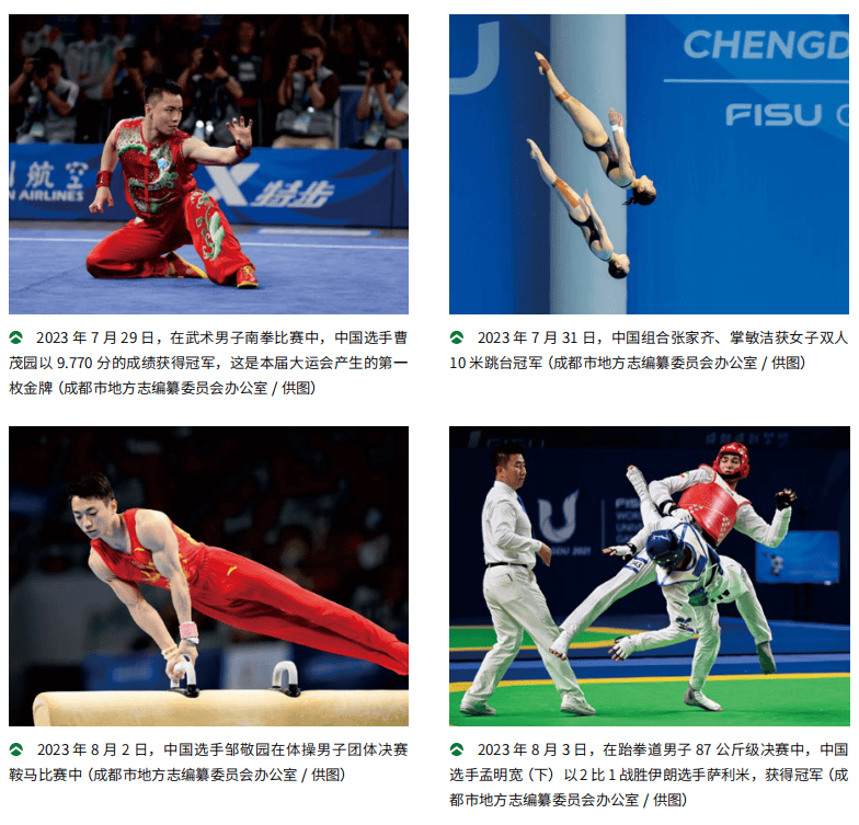 “成都成就梦想。”在这句口号的感召下,全球113个代表团、6500余名青年相聚成都,挥洒激情,奋力拼搏。成都大运会共设置射箭、体操、田径、羽毛球、篮球、跳水、击剑、柔道、艺术体操、赛艇、射击、游泳、乒乓球、跆拳道、网球、排球、水球和武术共18个竞赛项目、269个小项。