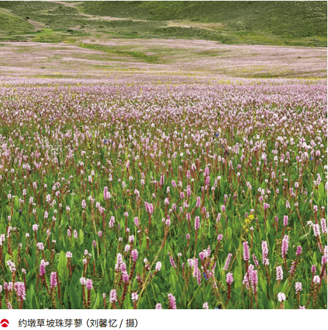 我正从小火锅里夹一片松茸放到嘴里,听到他说草原花开,我顿感芳香满溢,松茸的清香化入草原花海。从理塘到下坝的路,丁真原来要走一天的路程,我们来时开车只需用一个半小时,而在海拔4400米的约墩草坡,珠芽蓼盛开的场景也来到了眼前。路边宽阔的草坡,正向远处的山体延伸,细细的珠芽蓼密密地站着,举着一个个红粉色小火炬,酱色的棒状花序里,一朵朵珍珠样的红粉色的花苞探出头来,展开半透明的红粉花瓣。在椭圆叶片衬托下,一半是娇美,一半是热烈。一整片草原上只见红粉。小心翼翼躲避高原反应的我,立刻激动请求阿旺老师停车。上了草坡,云锦从脚下铺开,突然就不敢举步,抬起脚就不忍放下,每一步都会踩到花。缓缓几步,细细去看花,珠芽蓼个头虽小,却也花开成阵,辽远盛大。伸向远处的红粉隐入远山的烟雨青色之中,湿漉漉的云正要下到地上来。拍了几张照片,渺小的我嘴唇乌紫,心跳加快。只得回到车上,贪吸氧气。