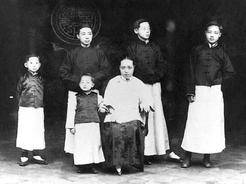 李尧林(右二)和巴金(右一)离开四川前与继母和兄弟们的合影,后排右三为李尧枚(四川文艺出版社 供图,图源:四川日报)