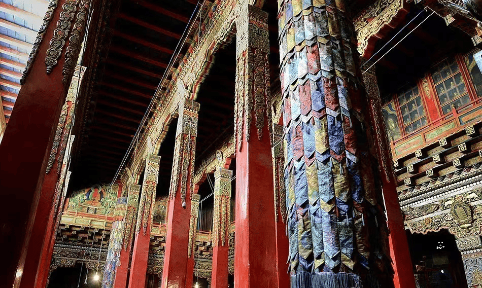 大经堂建于清代道光十四年(1834年),内柱上端及雀替上的佛像及花鸟雕刻精美并涂饰金粉,富丽堂皇。