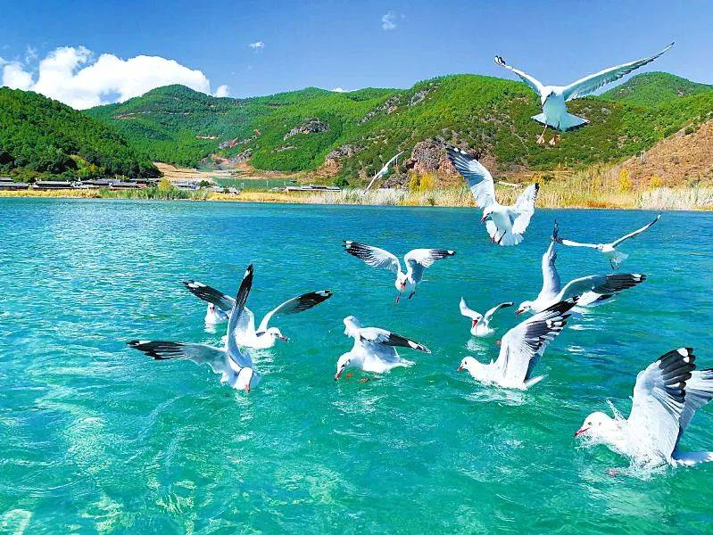 在泸沽湖中嬉戏的红嘴鸥(徐大喵 摄,图源:四川日报)