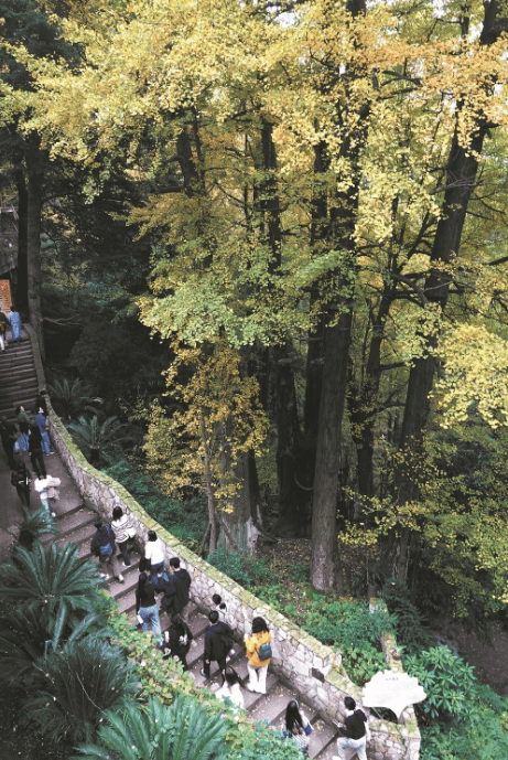 白岩寺整个山林瑞气氤氲,峻峭的白岩宛若一面两翼展开的巨大屏风,在阳光下闪耀着白亮的银光。层叠的庙宇、树木、阶梯错列在白色巨崖下,迎着东方的朝阳。遇上冬日温暖的阳光,山林间所有的植物如被激活一般,不只银杏,还有水杉、枫、樟、楠、柏、槐、桐、漆、棬、栾树、黄连木以及叫不出名的杂树,赤橙黄绿青蓝紫,道不出的惊艳。那些树,个个风姿绰约,生机盎然,或俊俏雄奇,或华贵典雅,或婉约含蓄,仿佛都穿上了节日的盛装,共赴一场惊天动地的金色盛宴。