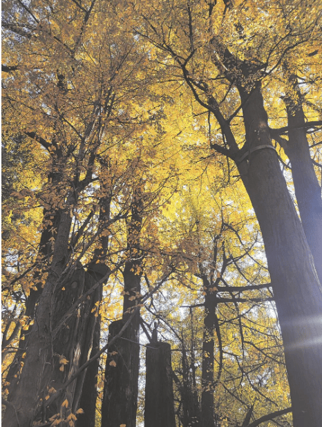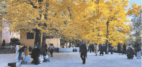 清晨的阳光打在“九子银杏”上,金色的树叶在晨光照耀下流光溢彩,笔直的树干仿佛镀上了一层古铜色,神圣而庄严。瀑布一样的枝叶涂抹了一层鲜亮的金色油彩,温暖又活泼。