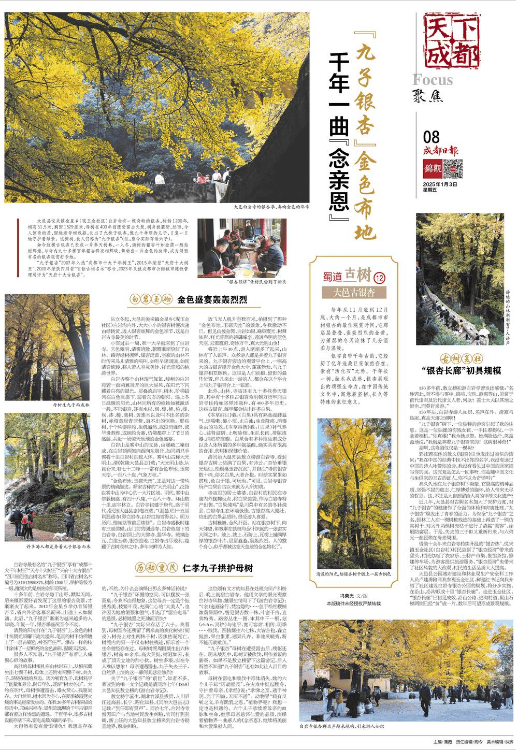 “九子银杏”2007年入选“成都市十大千年树王”,2015年荣登“天府十大树王”,2020年荣获四川省“百佳古树名木”称号,2023年又被成都市公园城市建设管理局评为“天府十大古银杏”。
