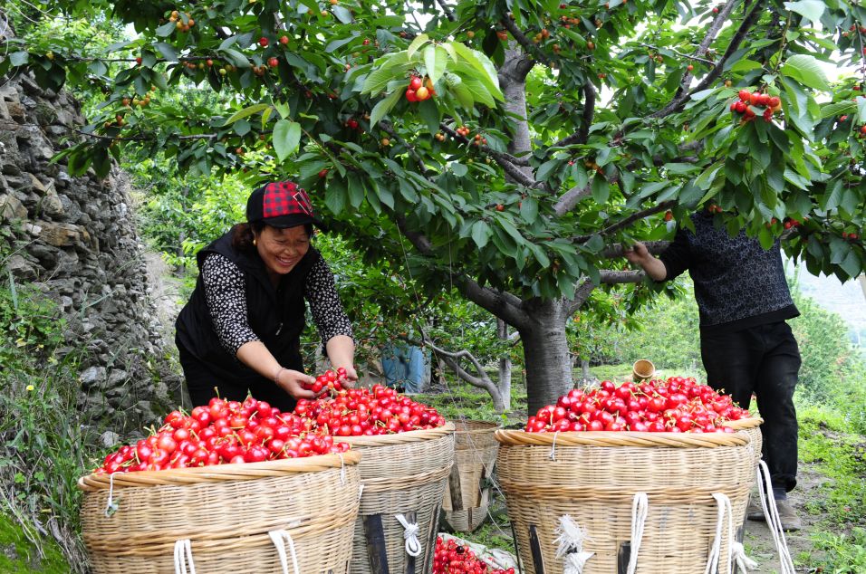 威州镇布瓦村在半山腰上,海拔1600米到2400米左右,800亩采摘基地一般在5月下旬结满了红彤彤的甜樱桃。