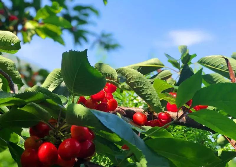 大约等到5月底,这里的甜樱桃才开始全面成熟,红红的挂在树梢。