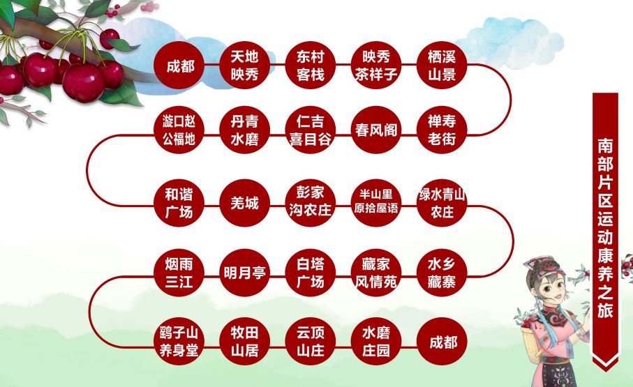 成都——天地映秀——东村客栈——映秀茶祥子——栖溪山景——漩口赵公福地——丹青水磨——仁吉喜目谷——春风阁——禅寿老街——和谐广场——羌城——彭家沟农庄——半山里•原拾屋语——绿水青山农庄——烟雨三江——明月亭——白塔广场——藏家风情苑——水乡藏寨——鹞子山养身堂——牧田山居——云顶山庄——水磨庄园——成都。