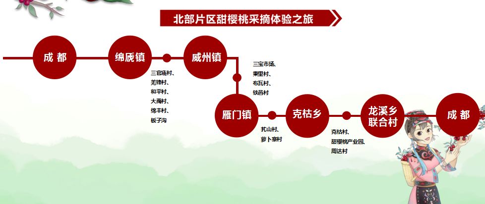 成都——绵虒镇(三官庙村、羌锋村、和平村、大禹村、绵丰村、板子沟)——威州镇(三宝市场、秉里村、布瓦村、铁邑村)——雁门镇(芤山村、萝卜寨村)——克枯乡(克枯村、甜樱桃产业园、周达村)——龙溪乡联合村——成都。