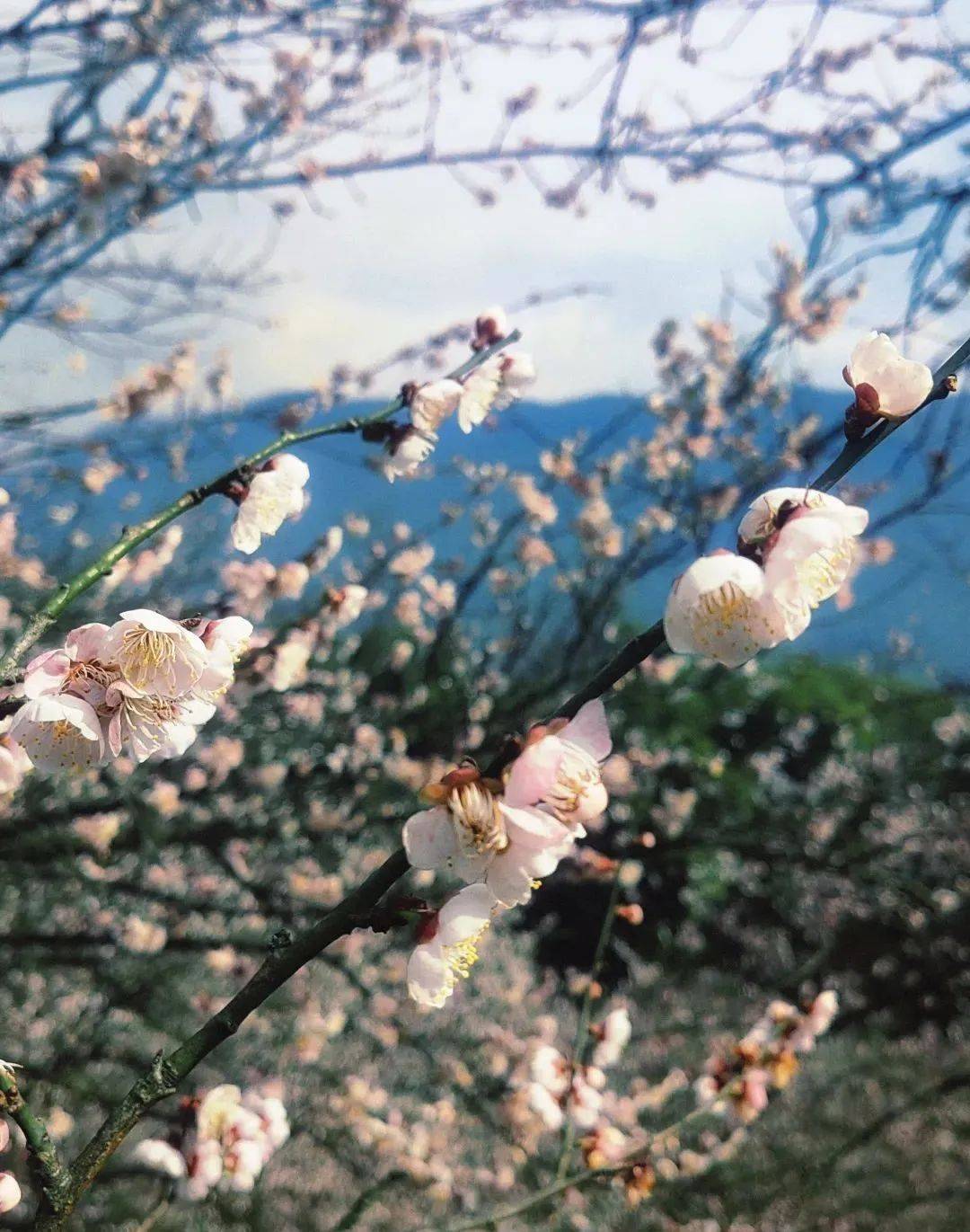 我们走在山间小路,与那些矮小的梅树亲密接触。山坡上的石头,布满了青苔,泛着绿油油的光,极具生命力。粉红的梅花,在石头的映衬下,色彩搭配张力十足,格外好看。