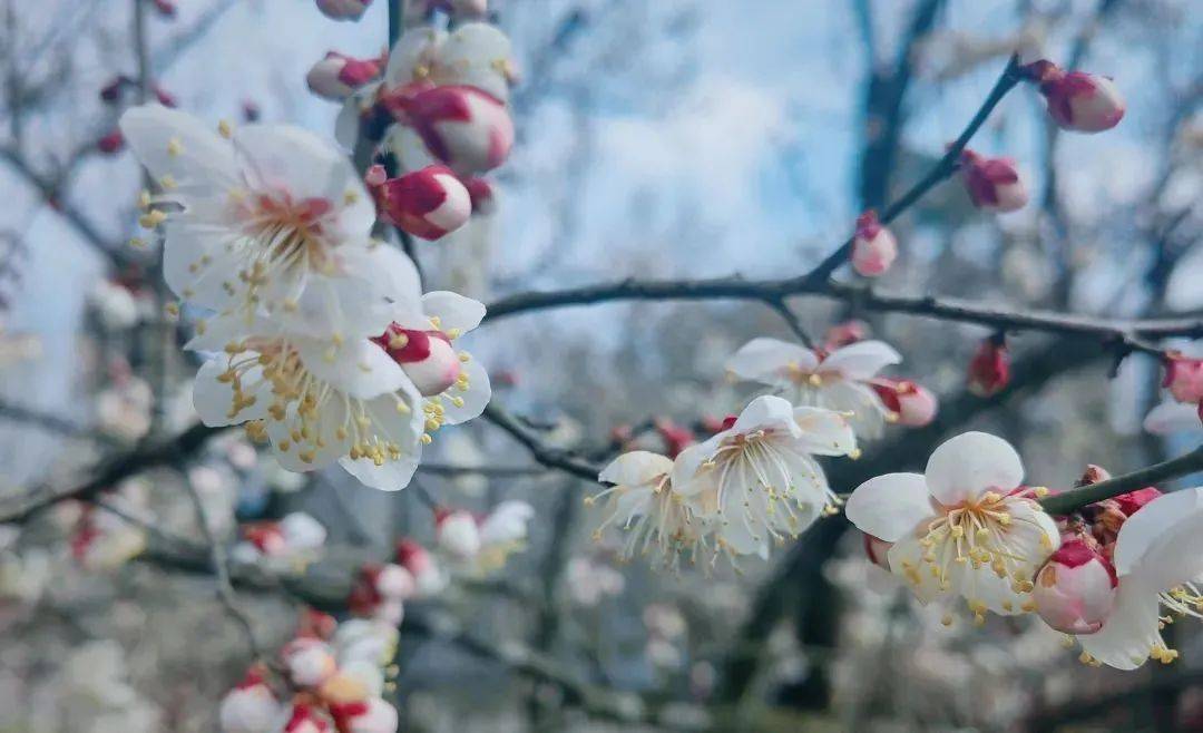 道路两旁的梅花,有单独一颗的,丰姿卓约;有三五成群的,高低错落;有成片成林的,花如瀑布。连风里都带着梅花的香味。