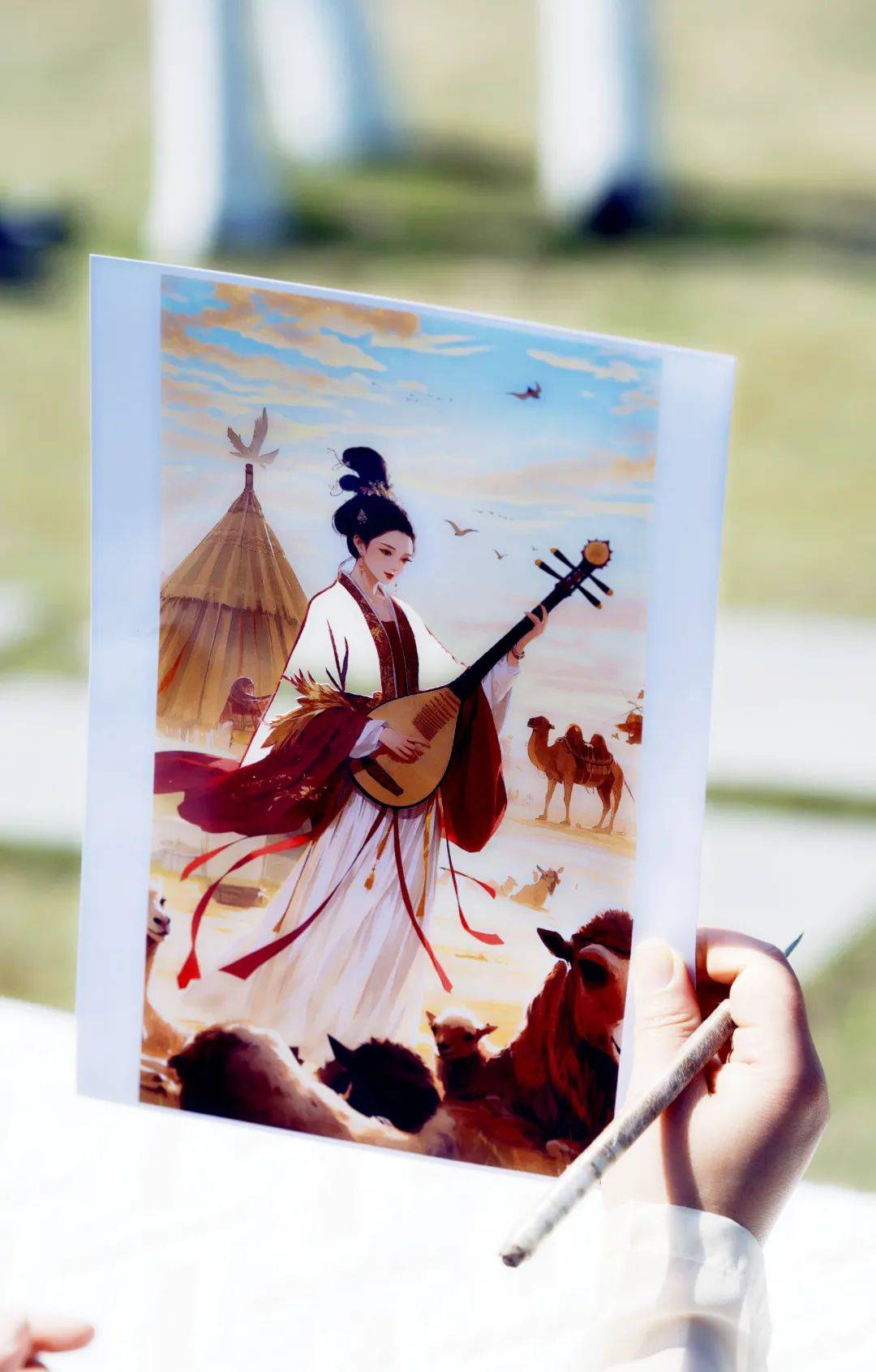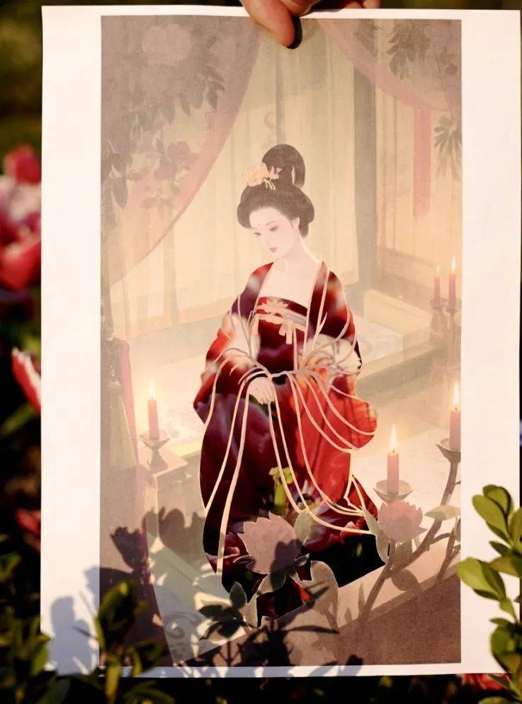 这是一场现代与古代的“对话”,游琴舒特别重视,她穿上汉服,化上精致的妆容,带上剪刀、刻刀、AI绘制好的美人图案,自驾来到广都博物馆、永安湖森林公园等地,或站或坐在花海里,用春风与春花呼唤美人,用刀与纸剪出美人们的绝代风华。