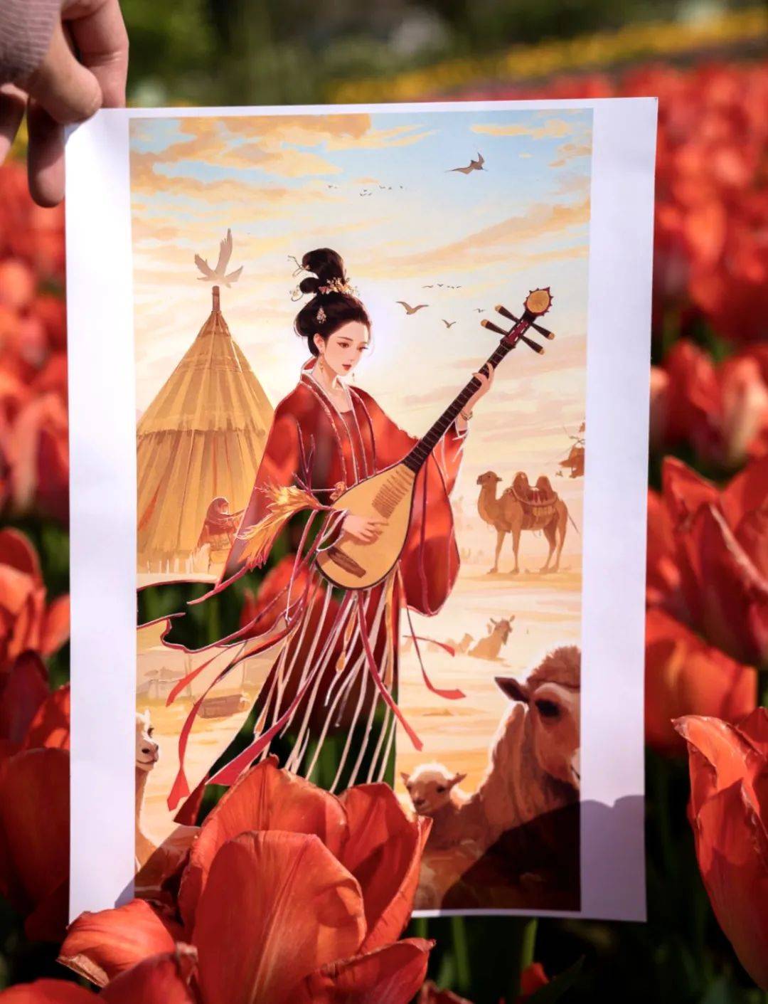 塞外的风卷起猩红花浪,王昭君遗落的琵琶弦崩裂处,红郁金香正烈烈燃烧,花瓣层叠翻涌如未央宫最后一夜的血色罗裙,像极了未央宫前她最后一次跪拜时倔强挺直的脊梁。