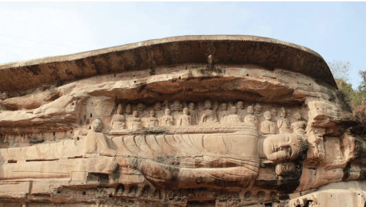 九截龙山位于安岳县境内,与东禅镇境内的明月寨隔水相望,遥相呼应。这座山由连绵起伏的九座小山组成,山形绵长,山势灵动,状如游龙,人们称之为“九截龙”。卧佛院则位于安岳县八庙乡的卧佛沟里,与东禅镇相邻。在卧佛沟的两边崖壁上,古代艺术家留下了139个大小龛窟、1600余尊造像,其中最宏伟壮观的当数唐代的“释迦牟尼涅槃图”,就是通常所说的“卧佛”。卧佛院还有著名的“卧佛沟藏经洞”,存刻于唐开元年间的石刻佛经15窟,共40余万字,极具研究观赏价值。