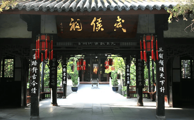 三国时期,刘备白帝城托孤,诸葛亮病卒五丈原,蜀人为表达景仰与追思,合武侯祠与汉昭烈庙为一体,成了君臣合祀祠庙。自明蜀王朱椿开始,历代蜀地王侯多有修缮。武侯祠内红墙青瓦,榕树参天,庙宇幽深肃穆。石板路从雕梁画栋的正大门起始,把二门、文臣武将廊、刘备殿、诸葛亮殿和三义庙连成了一条直线。由竹海红廊,可通向汉昭烈皇帝之陵。出于对蜀汉英雄的敬仰,日日都有络绎不绝的游人来此瞻仰。在成都的历史遗迹里,武侯祠最能体现这座七朝古都的厚重历史。