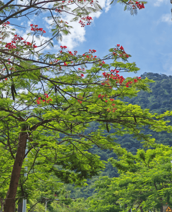 在朗朗晴空和阵阵山风之下,一排排凤凰树心领神会地扮演起了主人角色,争先恐后地向我们招手致意。它们又像军容严整、蓬勃朝气的仪仗队员,站着笔直的身板,列队迎接我们到来,并引导我们继续走向高处。