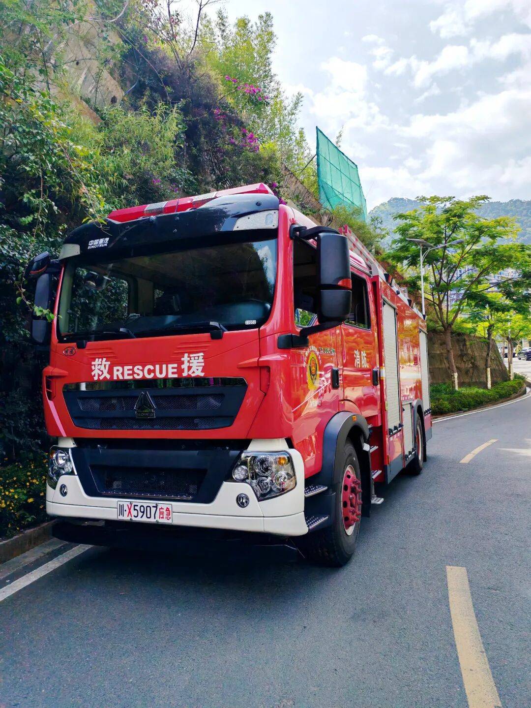 米易西山脚下的应急救援车(曾成 摄)