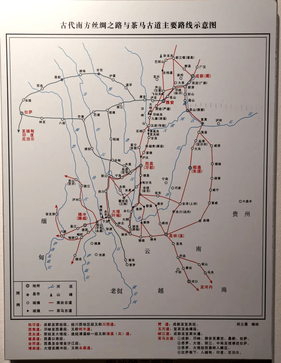 古代南方丝绸之路与茶马古道主要路线示意图(蓬州闲士摄于邛崃市临邛镇邛窑考古遗址公园,图源:四川方志图库)