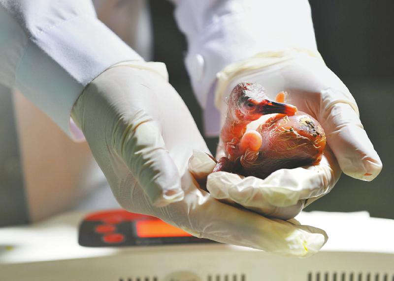 2017年4月18日11点08分,出生在四川的第一只朱鹮SC053号成功破壳。