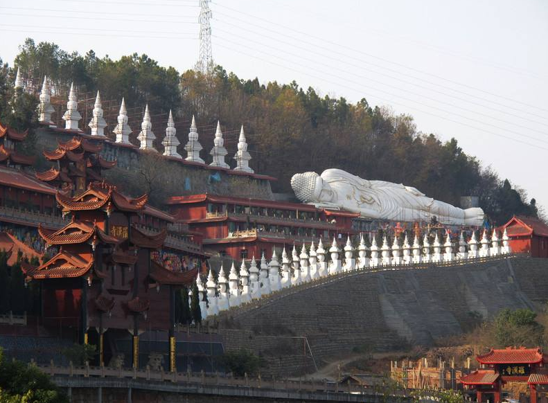 寺院占地面积10多万平方米,现有建筑面积3万多平方米。寺内沿中轴线修建了天王殿、观音殿、大悲殿、韦陀殿、大雄宝殿岿然屹立;两侧的玉佛殿、伽蓝殿、药王殿、地藏殿、观音亭、祖师殿、观音阁、唱经楼、三圣殿、万佛堂、卧佛等蔚为壮观;曲径旁的文殊菩萨及罗汉群像栩栩如生;老和尚灵骨塔和纪念堂庄严肃穆;花木绿荫掩映中楼台亭阁错落有致。