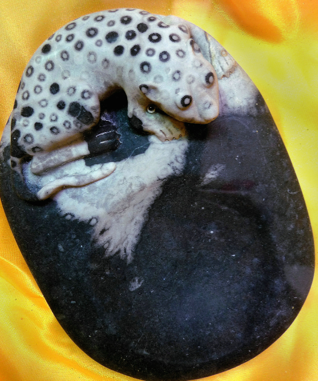 1993年夏,小黄从城关职中毕业,看到中江已没有几个人从事花石工艺品生产,感到十分可惜,便立志把这门传统工艺学到手,不让它失传。在他父亲和美术前辈蒋圣杰老师的悉心指点下,小黄进步很快,作品常常一完工就被爱好者买走。有一天傍晚,外地一辆黑色伏尔加轿车几经打听,停在他家门口——盐市街40号,来人选购了他几件作品,光是一只石龟就给了他800元,这真是应了花石艺人的一句老话:“三年不卖钱,卖钱吃三年”。由于他练就一种认识花石的特殊本领,一块表面有杂质的石料,小黄可以断定里面隐含着什么花纹。