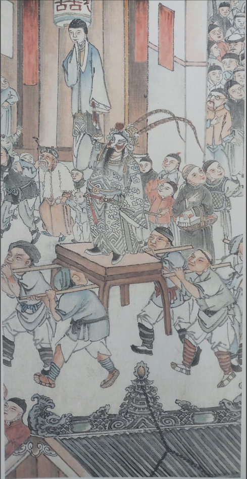 这幅画生动地反映了当时绵竹县城迎春盛会的实况,它从画面组合,人物服饰以及脸谱、装扮,无不体现写实手法,细腻明快、堪称佳品。同时,它通过热闹的节日场面,反映了清末时期绵竹人民的戏剧生活。