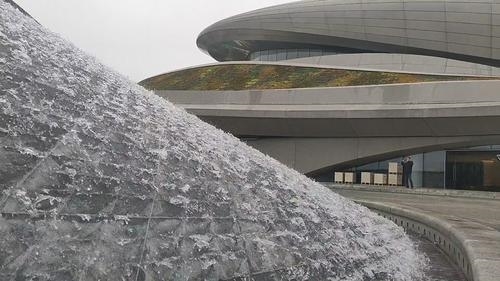 “叠水花园由两千七百八十一块石材拼凑而成,造型由两万五千个图形不规则菱形组成,且深度由50mm渐变为8mm,每一块的四边长度、雕刻深度、菱形单元的规格均不相同。”中建五局独角兽岛启动区项目经理贺鑫介绍,除此之外,门口的行人与车辆通行区域还安装了动力感应系统,汽车感应控制喷泉系统是在人体感应互动喷泉的基础上演变而来,通过汽车行驶对路面产生的压力形成水随车走,喷泉的起落与车辆行驶形成交相呼应。“这些水源都是通过净化系统处理后重复利用。下雨天也会通过蓄水箱适量储存雨水,以供外立面的绿化灌溉等。”