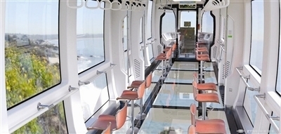 从内饰方面来看,全透明方案除了顶部不透明外,其余部位均采用透明设计,270度透明车厢将空铁观光效果发挥至极致。落地式玻璃车窗可以带来开阔的视野,透明的地板更可带来惊心动魄的体验,吧凳的设计更加休闲,也更利于观光。另一种车辆则相对传统,车厢内部有些类似于地铁车厢,横排或纵排的座椅,供人坐在车厢中尽赏窗外美景。
