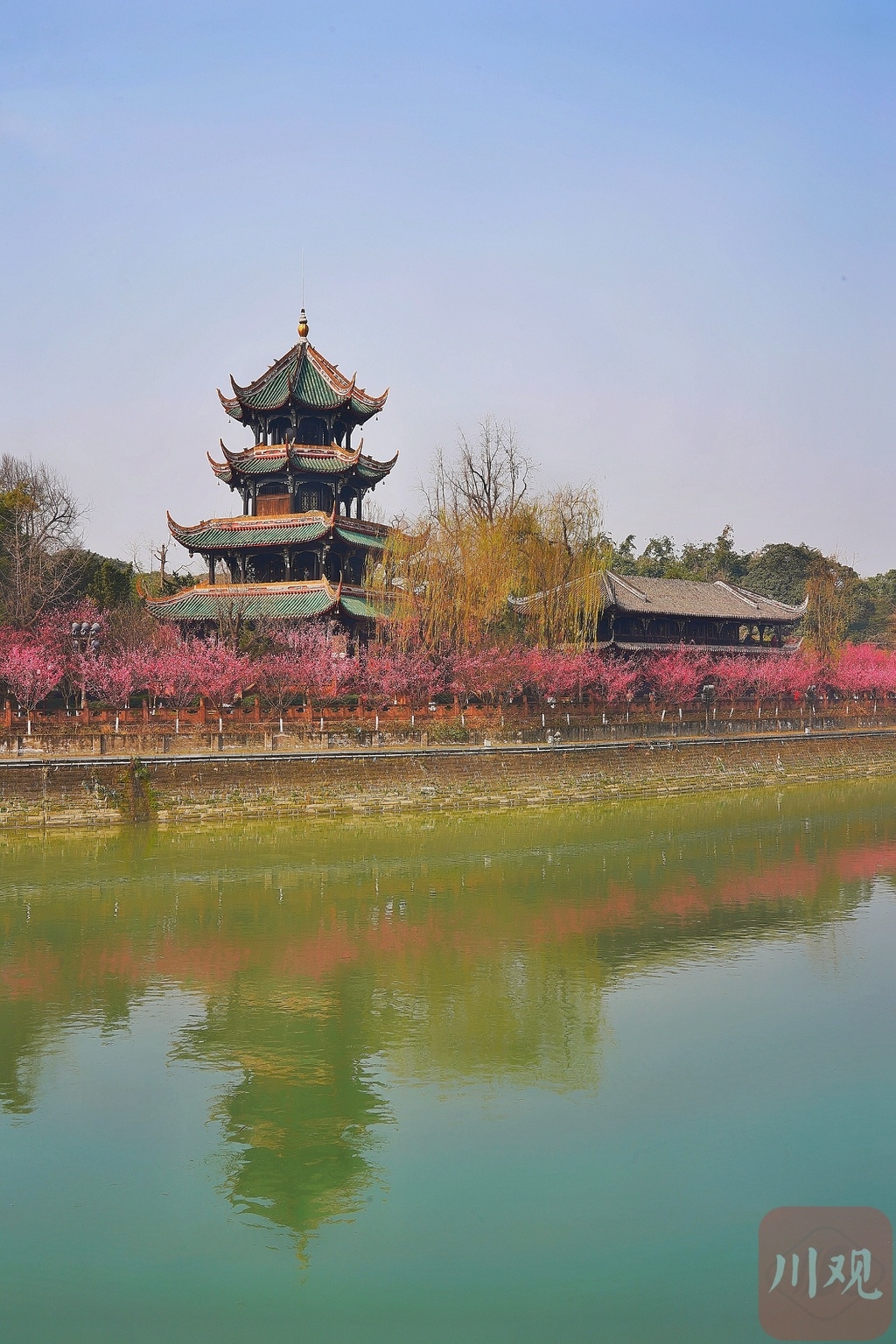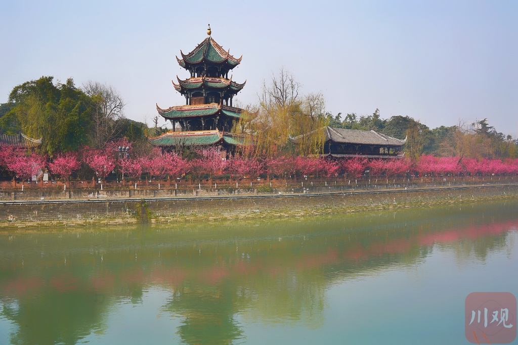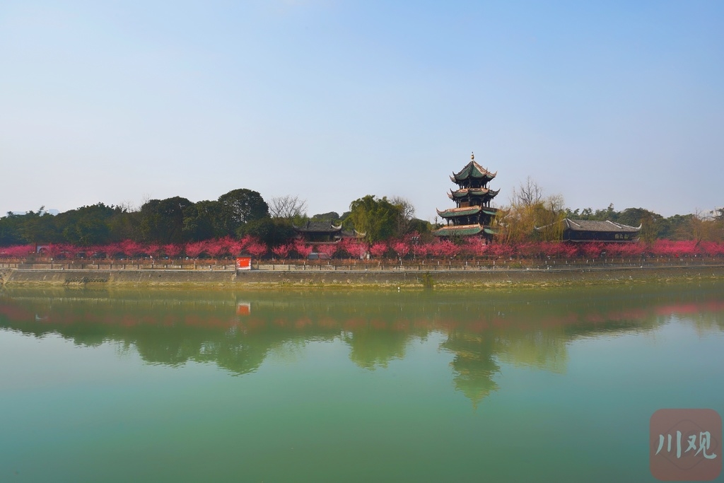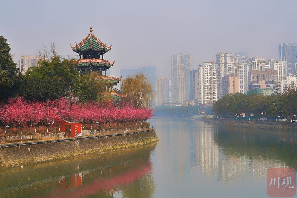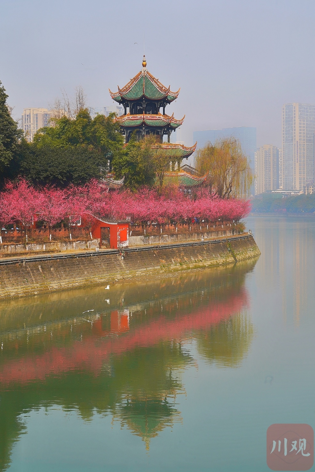姹紫嫣红遍开望江沿岸,绿意盎然轻拂扬柳枝。2月9日,成都望江楼下红梅绽放,江水倒映出春意盎然的美景,新春时节,“原年人”赏花、观景正当时。