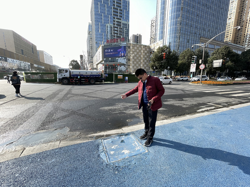 2月5日,成都高新区锦城大道和交子南一路的交岔口,成都高投建设开发有限公司项目经理周建一边查看地面的方形井盖,一边向同事比划着。