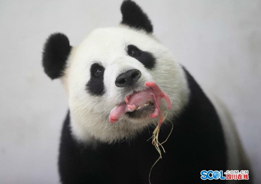 中国大熊猫保护研究中心神树坪基地,一只大熊猫妈妈和它的新生儿。 摄影/何海洋