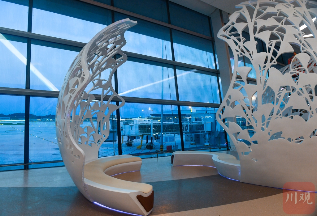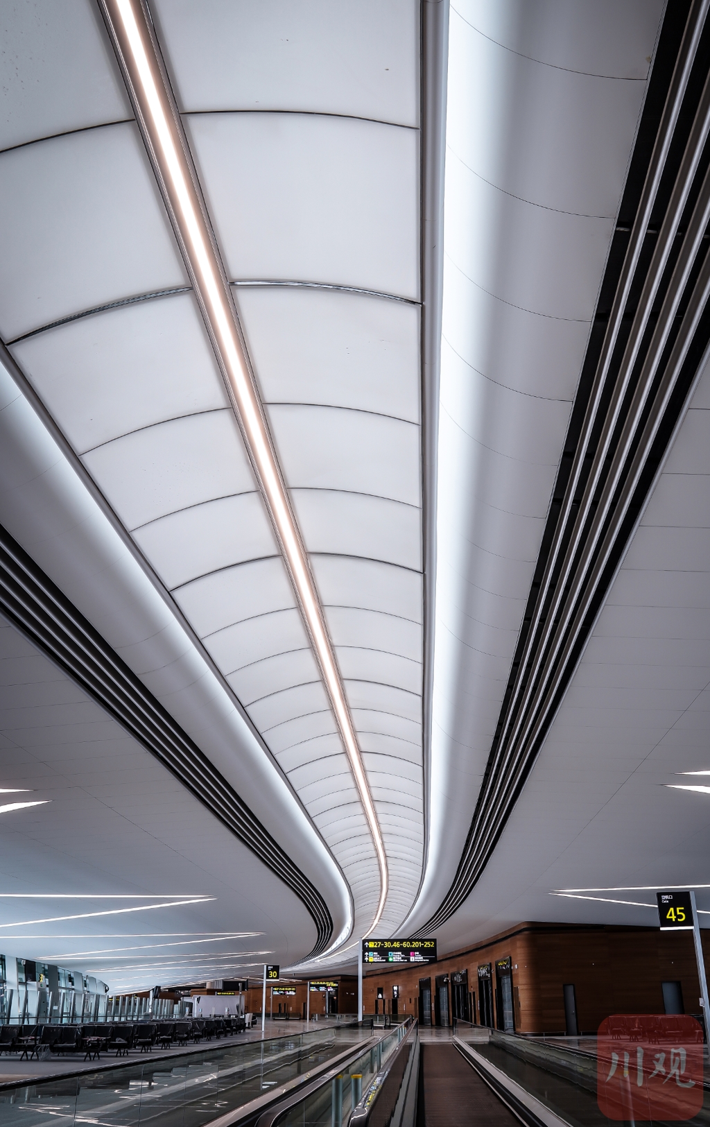 航站楼的设计理念源于成都金沙遗址出土的商周太阳神鸟金饰,光芒包裹中的这座“超级工程”正将3000多年前的古蜀文明照进了现实。