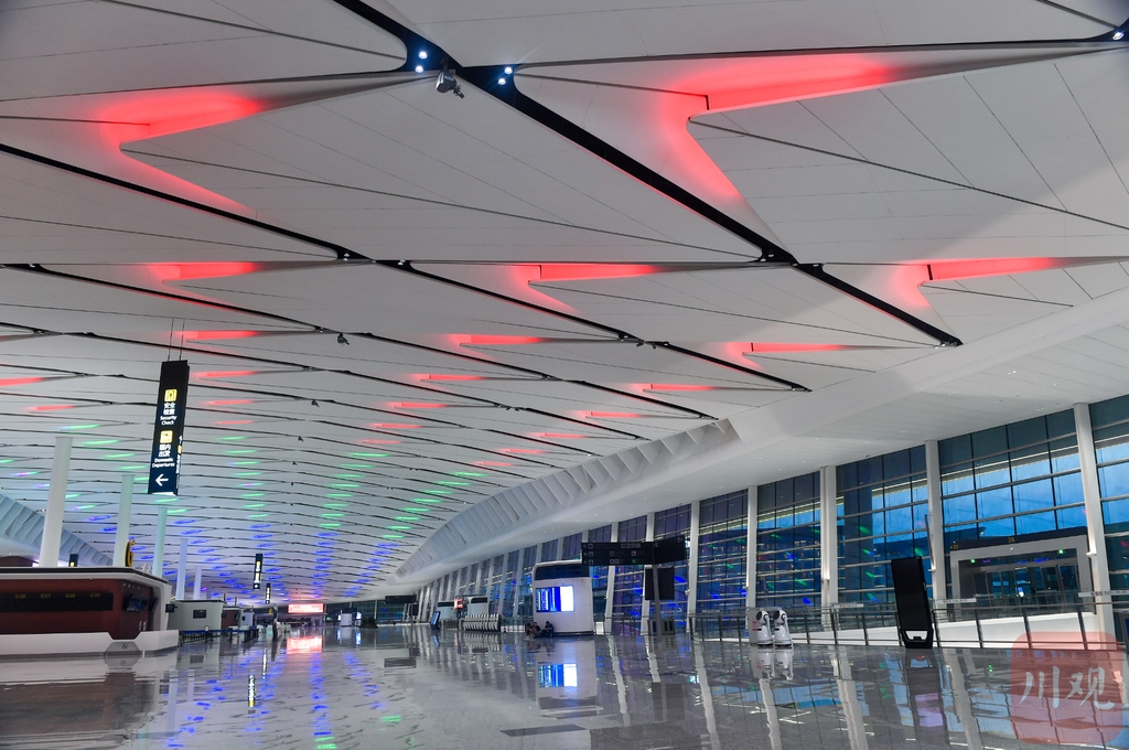 6月10日,T2航站楼内宏大的羽毛状吊顶灯带不时变换着色彩。