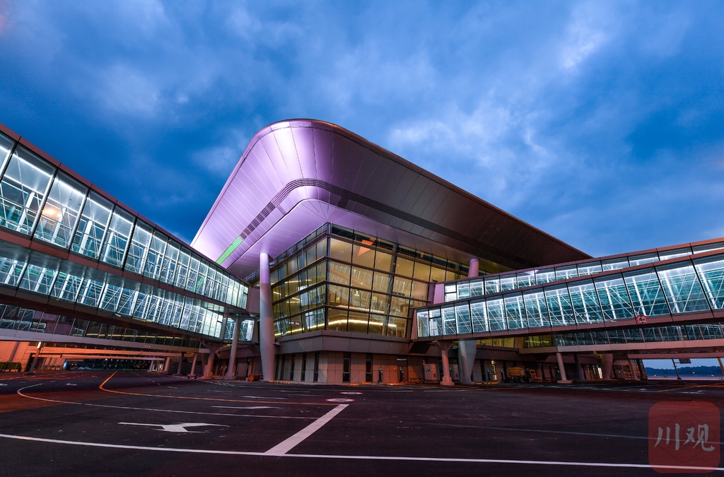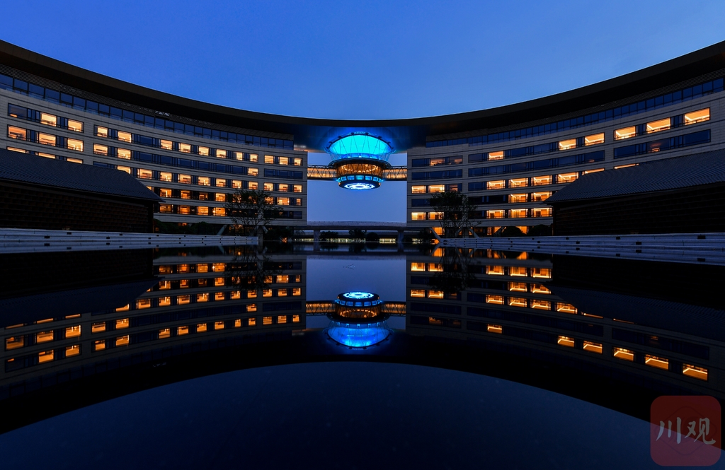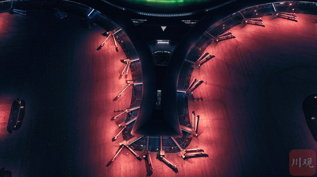 夜里8点,“天府之眼”发出蓝光,太阳神鸟的图案在夜色中亮得耀眼。成都天府国际机场投用后,“天府之眼”是新机场最好的打卡地,站在那里北可俯瞰整个酒店中央内景,南可观停机坪飞机起落。