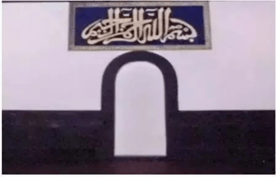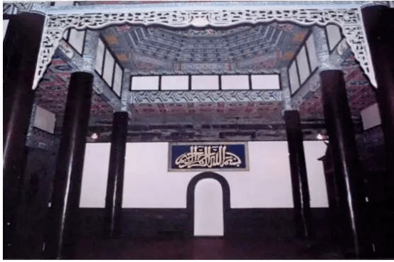 大殿西面后部用青砖砌筑成圣龛(凹壁),此处为礼拜殿内最圣神的地方,亦是朝拜方向的标志。其余三面均安装木格门,格心花纹古朴大方,采用镂空雕刻的工艺,制工精巧,整个格门虽不用彩色和油漆,完全是本色木面,但雕刻花纹上用贴金装饰,这样既古拙雅素,又华丽尊贵,是一种少见的装饰制度。