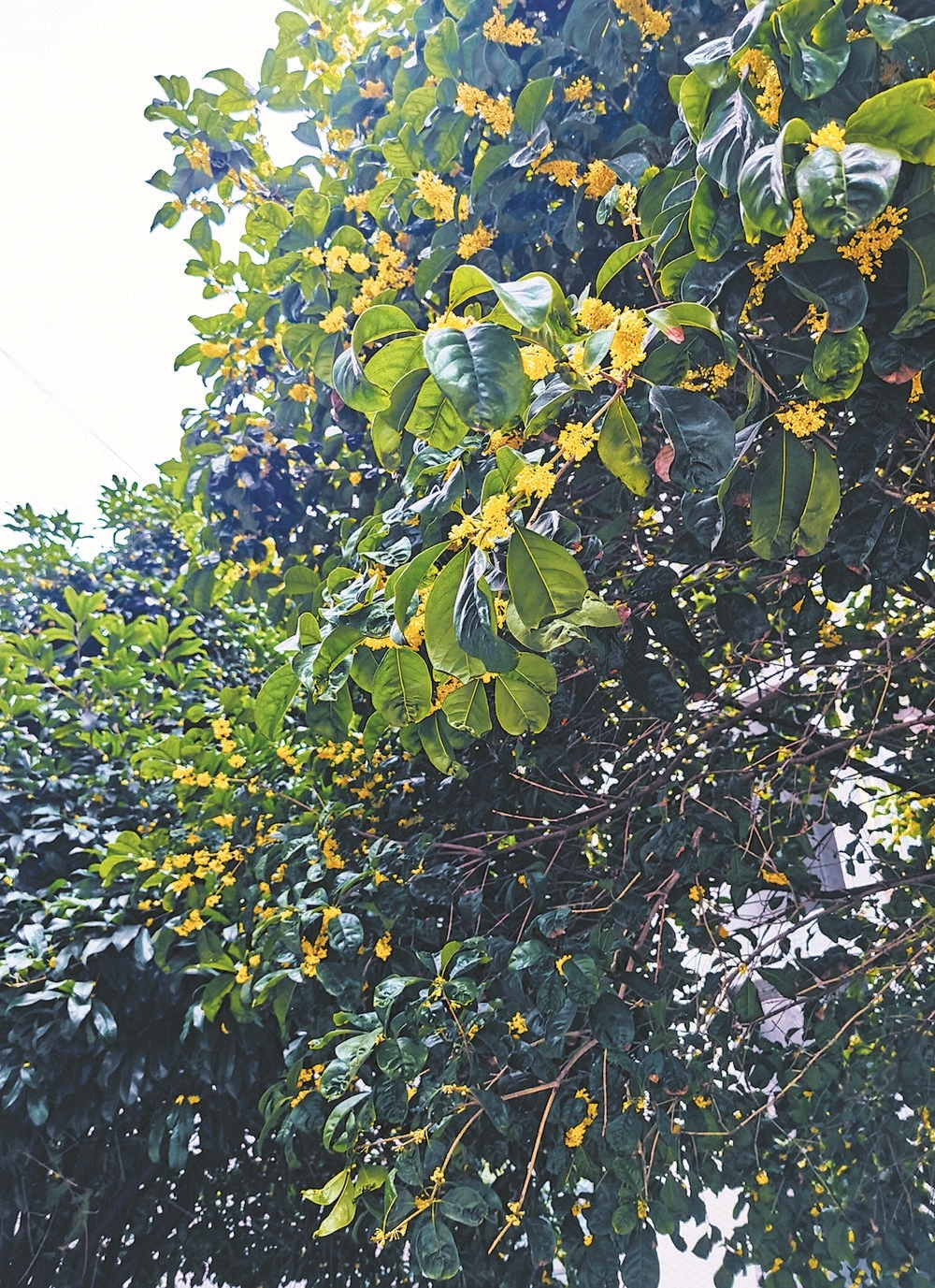 这不是孤立的个案。当天上午,记者又走访了部分公园、小区,发现均有桂花成片盛开。在成都植物园内,间或栽植着几种不同颜色的桂花,红色、白色都有,几种浓浓淡淡的桂花香交织在一起,令整个园区都沉浸在香气之中。