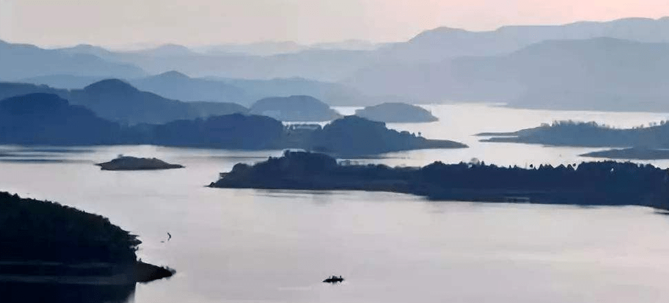 千岛湖光水吻天,轻舟犁浪压群峦。青松翠柏山花艳,蝶舞蜂飞太子颠。