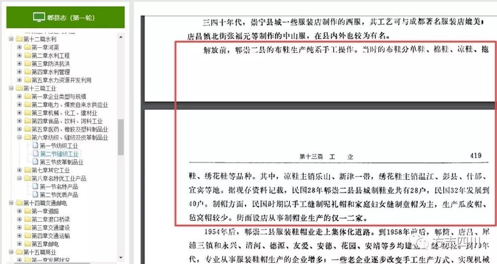 据第一轮《郫县志》载:“解放前,郫崇二县的布鞋生产纯系手工操作。当时的布鞋分单鞋、棉鞋、凉鞋、拖鞋、绣花鞋等品种。其中,凉鞋主销乐山、新津一带,绣花鞋主销温江、彭县、什邡、宜宾等地。据现存资料记载,民国28年郫崇二县县城制鞋业共有28户,民国32年发展到40户。”