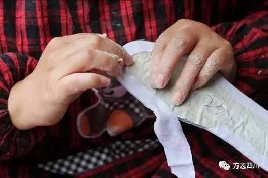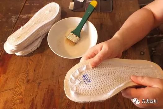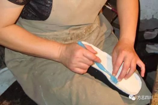 其次是一道制作唐昌布鞋的特殊工艺——“托里托面”。将浆糊浓稠度调制合适,取布壳置于手中,仅对布壳、里布、面料三层外边缘1cm进行粘和,手工刮平浆糊,帮面黏正。