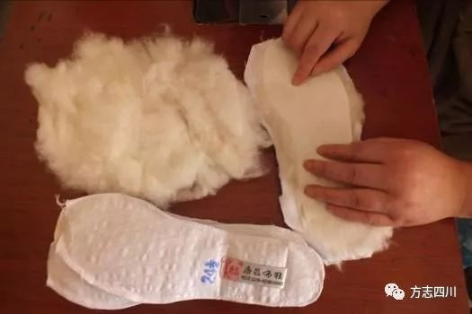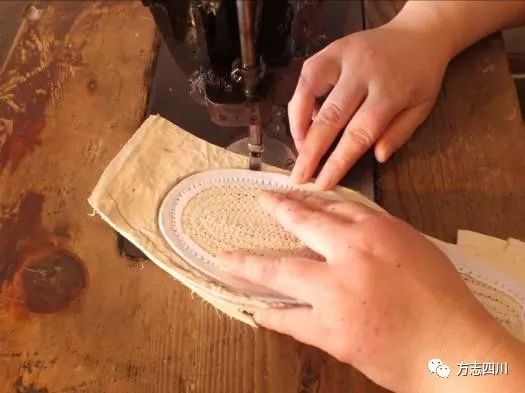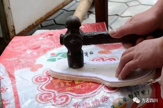 制作鞋底是唐昌布鞋所有工序中最重要的一环。使用十余层优质白色棉布包裹厚厚一层棉花,用专门的机器纳成鞋底,并需对鞋底进行捶打,让鞋底内部浆糊完全分离开来,降低鞋底硬度。这种鞋底被称为“千层底”,美观大方,舒适保暖,经久耐磨。