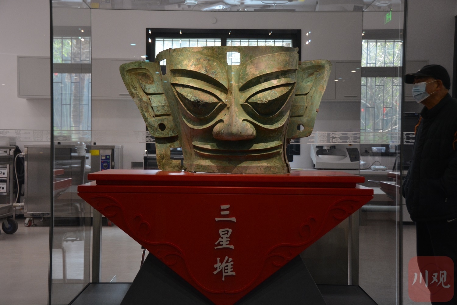 2月15日,在虎年央视春晚亮相的三星堆青铜大面具,正式在三星堆博物馆文物保护与修复馆向公众展出。