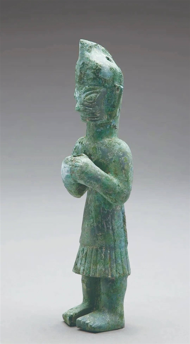 三号坑出土戴尖帽铜立人像