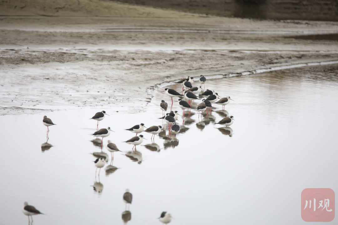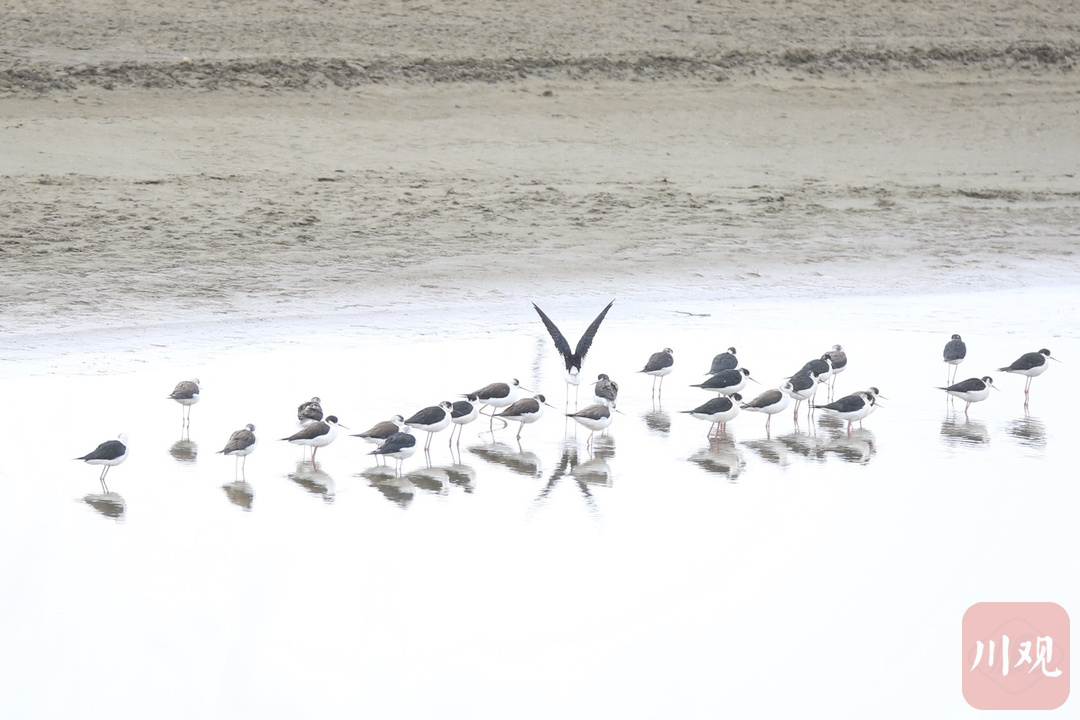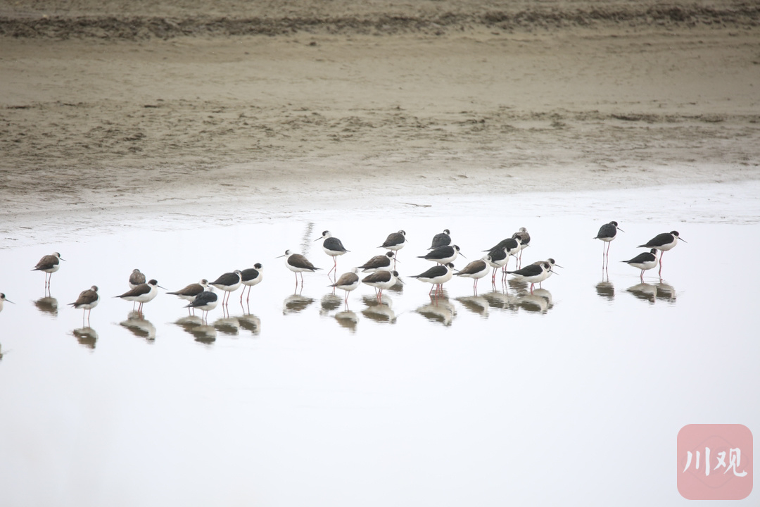 4月15日,在红原月亮湾湿地,珍稀候鸟——黑翅长脚鹬正在成排行走觅食。据悉,黑翅长脚鹬都拥有一副好身材, 它们拥有黑色的翅膀和长长的红色细腿,黑白红三色分明,身材高挑,无论是行走还是飞翔,姿态都十分优雅,它的嘴细长而笔直,体白翅黑,对比分明。不大的个头,却长了一双30多厘米长的细腿,堪称鸟界“超模” 。