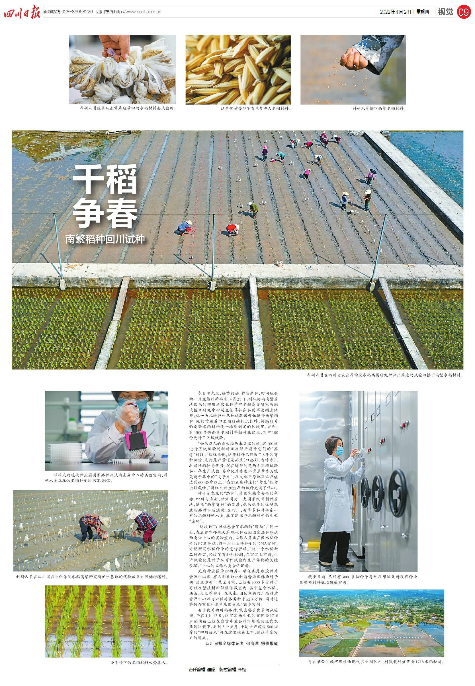 有了优质的川稻品种,就需要有更多的试验田。早在4月12日,适宜川南生长的宜优香1718水稻秧苗已经在自贡市荣县赖河坝粮油现代农业园区栽下。再过3个多月,平均亩产超过500公斤的“四川好米”将在这里收获上市,送达千家万户的餐桌。