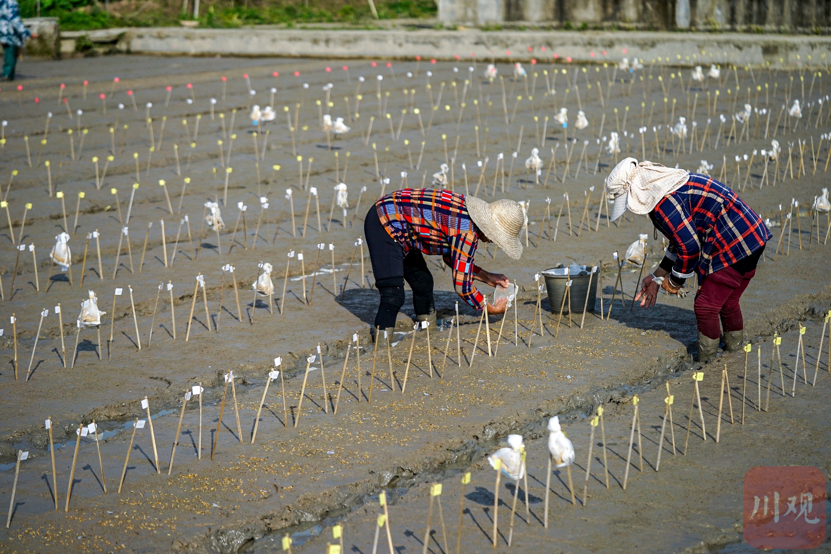 科研人员在四川省农业科学院水稻高粱研究所泸州基地的试验田里对照标杆播种。