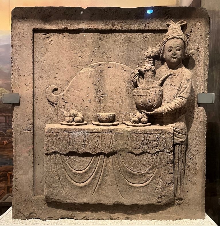例如,泸州盛产美酒,在宋代即是著名的酒城,泸县宋代石刻有多件反映酒业生产和酒文化。在“持注子女侍石刻”中,有一桌、一椅、一女侍仆,女子身穿圆领长裙,手上拿着酒壶站立于桌椅旁,表现了宋人准备饮酒就餐的场景。
