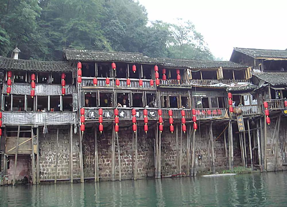 古镇吊脚楼,依山傍水建于古镇内邻河的油坊街、姜市街一带,兴建于唐代,盛于明清,全木质结构,整个楼阁飞檐翘角,雕梁画栋,有的一层,有的两层,有的三层,最高的达四层。有的在房顶伸出,有的从房的中部伸出,有的从楼脚下伸出,还有的从窗户外伸出,有的吊脚楼从一层至另一层有凉梯相连。独特的吊脚楼,以及悬山、歇山式屋顶的相互辉映,形成独具传统的建筑特征,具有浓郁的历史、艺术、科学价值。